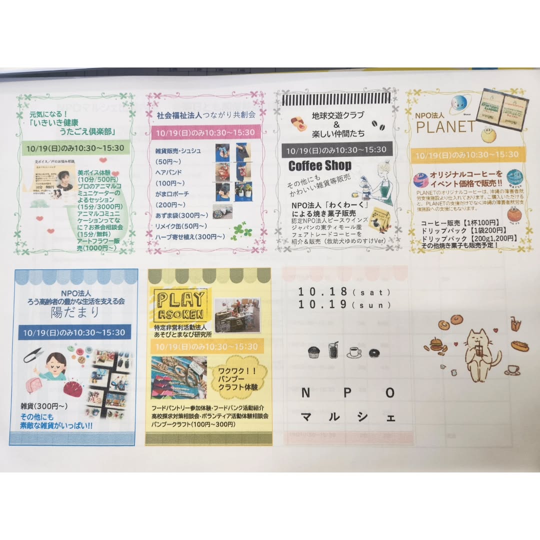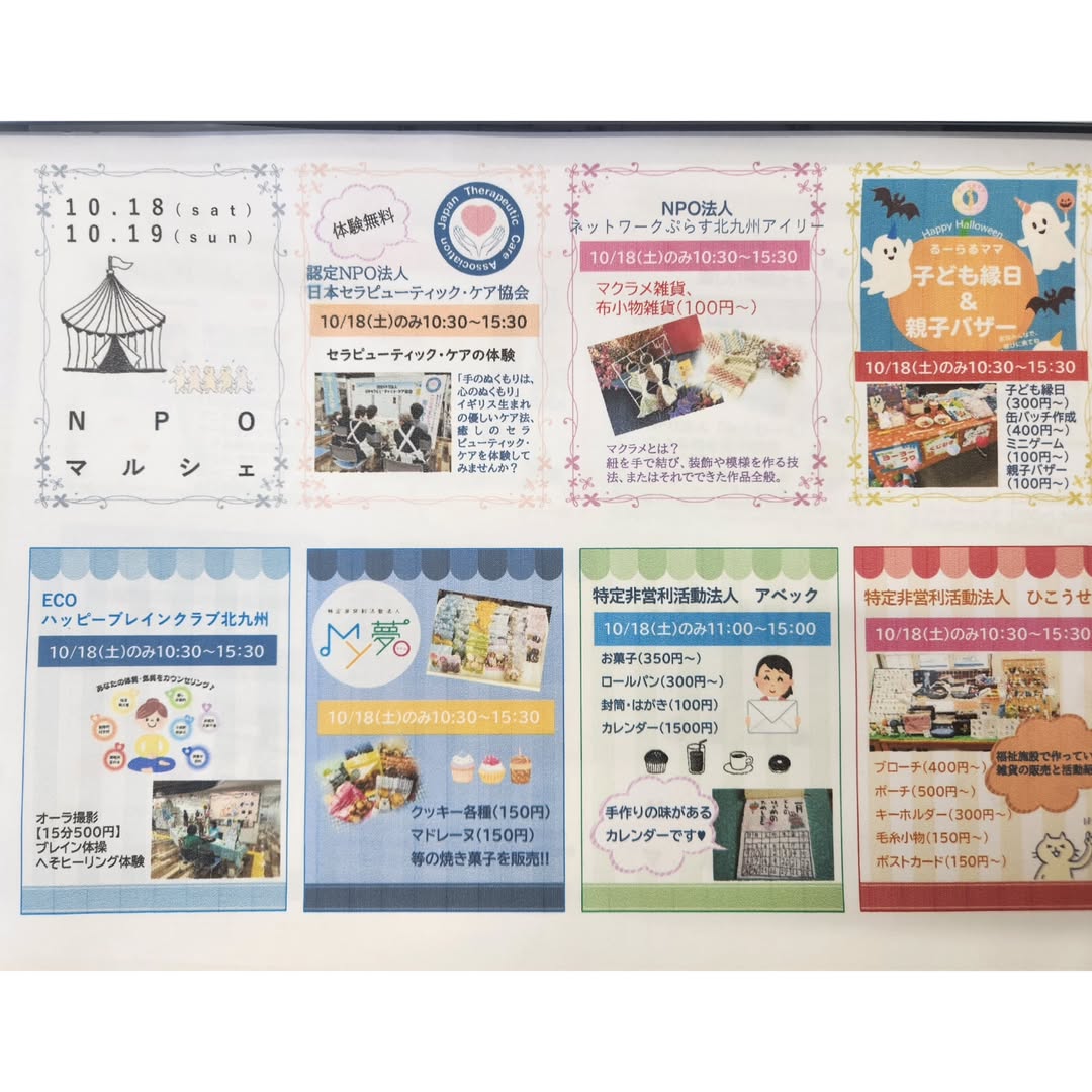 お知らせ イベント NPOマルシェの出店者情報 少し画像が小さいですがMy夢が、今月の18日土曜日にでるNPOマルシェの出店者情報です。 My夢は土曜日のみの出店です。どうぞよろしくお願いします! COM CITY三階遊びに来てくださいね!
