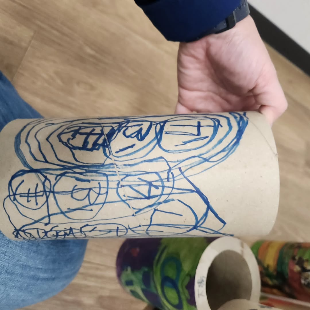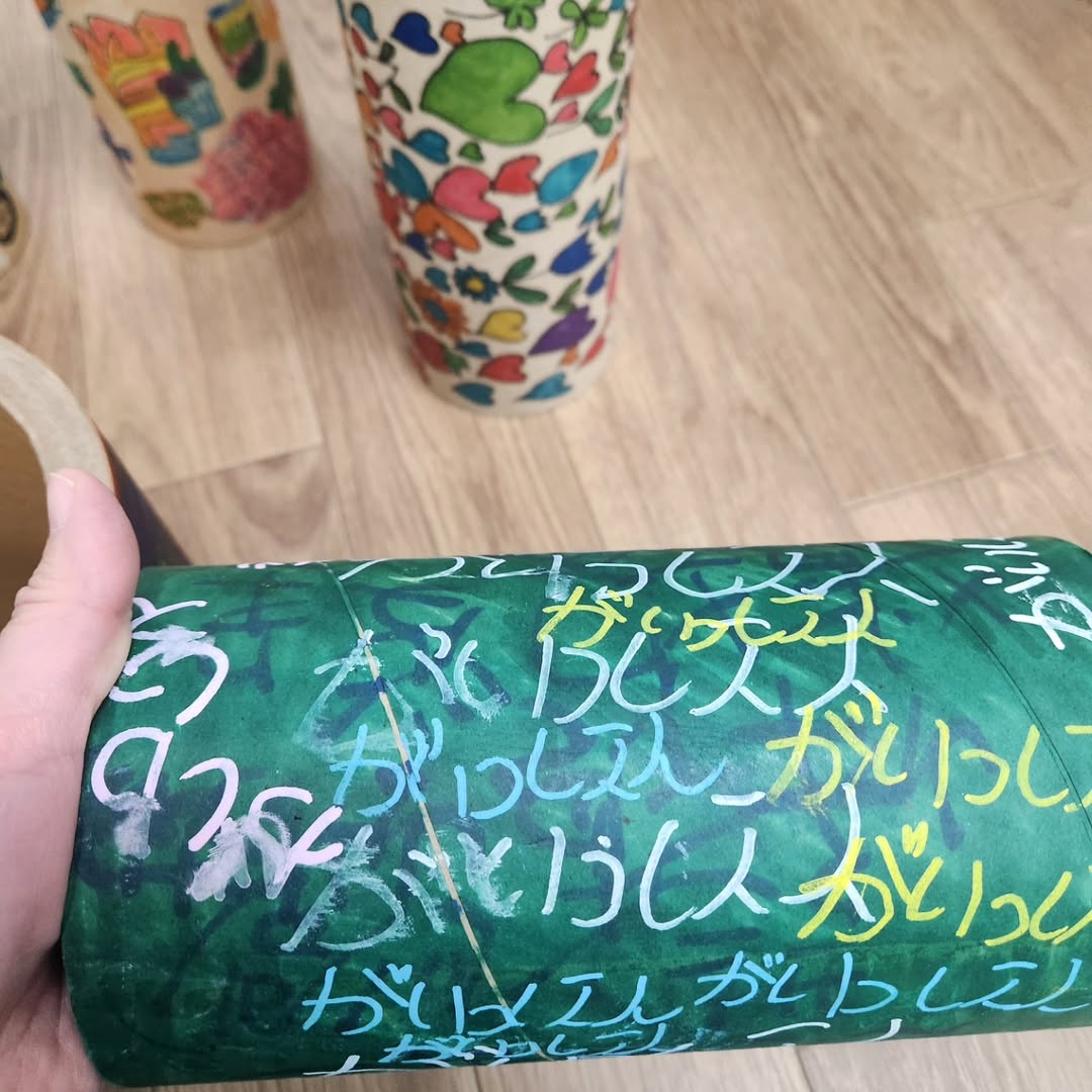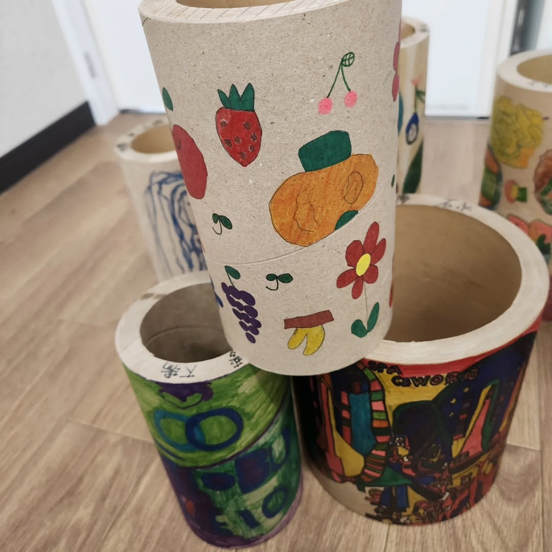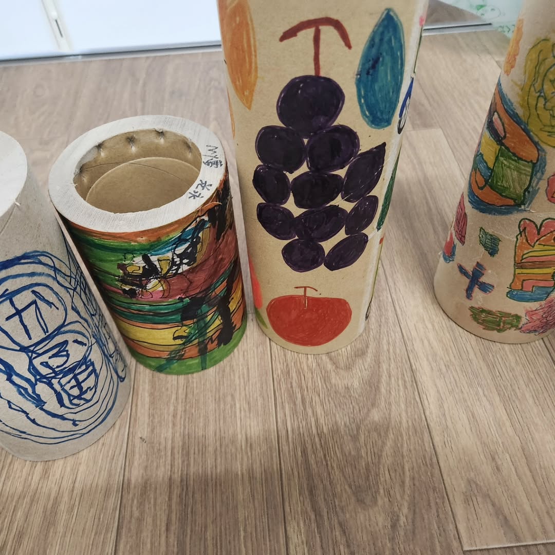 この紙管、実はけっこう大きくて丸くて、描くのがなかなか難しそうだったのですが、みんな本当に上手!それぞれの個性があふれる素敵な作品になりました✨